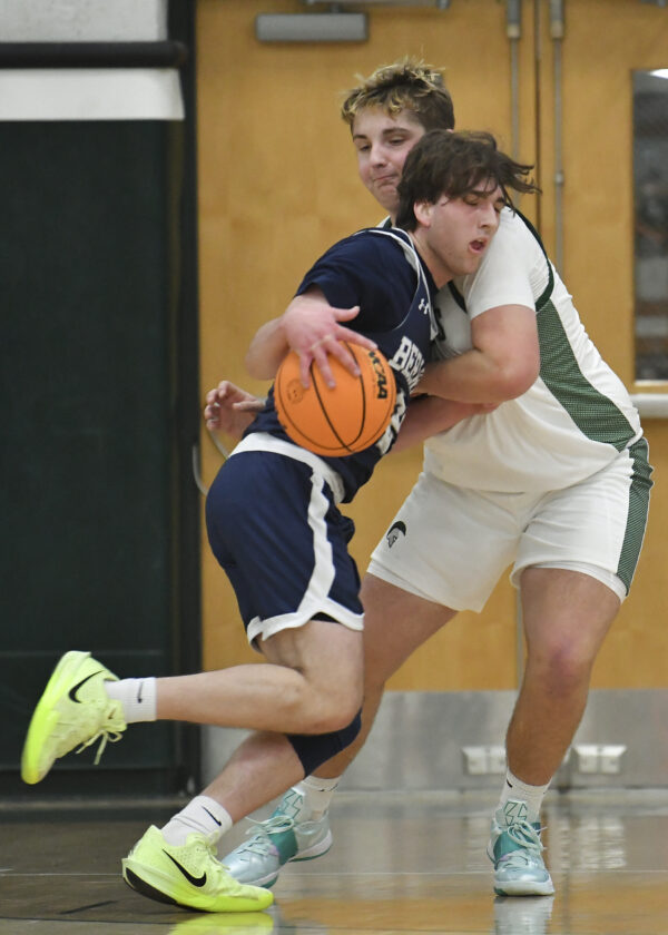 - RALPH WILSON/Sun-Gazette Correspondent Hughesville’s Gavin Knarr brings the ball around Berwick’s Alex Estrella during a high school boys basketball game at Hughesville on Saturday.