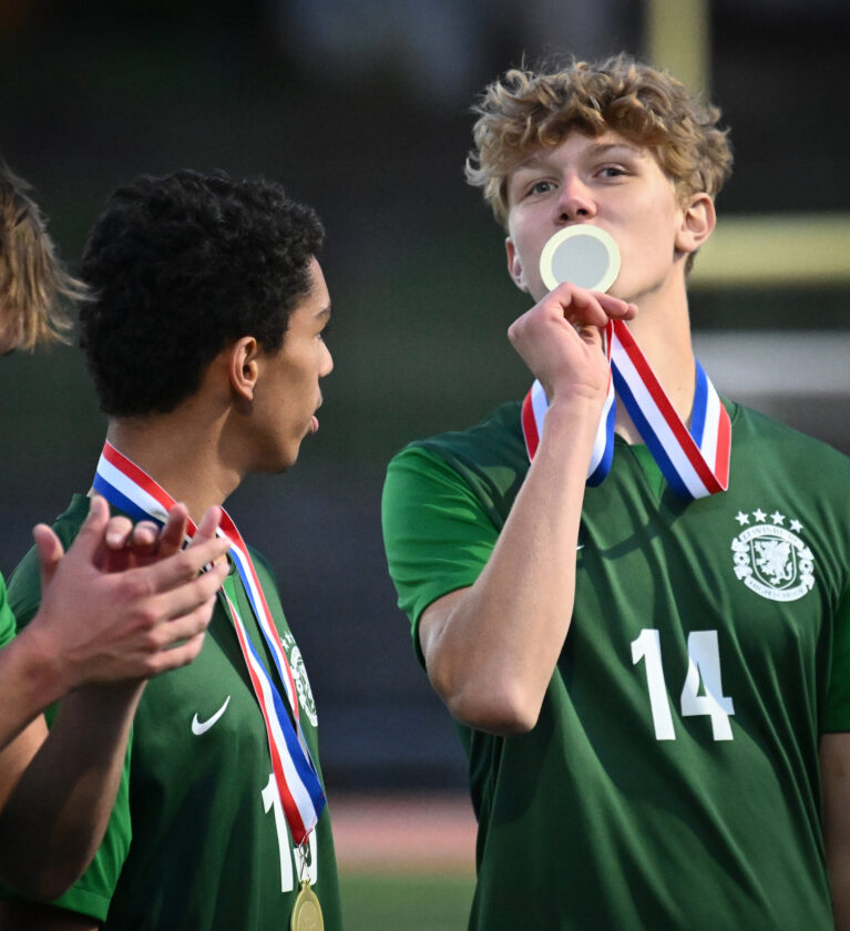 RALPH WILSON/Sun-Gazette Correspondent Lewisburg’s Logan Kitchens (14) kisses his championship medal this year. Under coach Ben Kettlewell, Lewisburg has won 261 games since 2013 when he was a co-coach with Skip Kratzer.