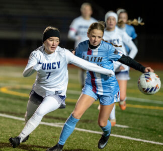 - Rosie Zalonis of Muncy pushes the ball up the field as she’s guarded by Teagyn Celone of Faith Christian at North Schuylkill High School. Faith Christian won 3-0. DAVE KENNEDY/Sun-Gazette