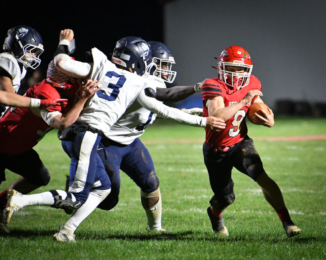 - RALPH WILSON/Sun-Gazette Correspondent Montgomery’s Josh Knoebel (9) runs the ball around the Muncy defense during a District 4 Class A football playoff game at Montgomery on Friday. Montgomery won 33-0.