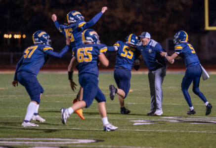 Montoursville celebrate the game winning field goal by Adam Shearer (15) against Mt. Carmel at Montoursville High School Friday night. Montoursville won in triple overtime 43-42. DAVE KENNEDY/Sun-Gazette