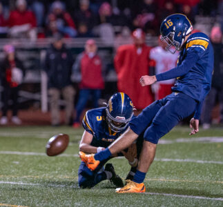 Adam Shearer of Montoursville kicks the game winning field goal against Mt. Carmel at Montoursville High School Friday night. Montoursville won in triple overtime 43-42. DAVE KENNEDY/Sun-Gazette