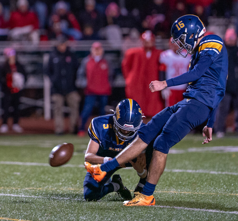 - Adam Shearer of Montoursville kicks the game winning field goal against Mt. Carmel at Montoursville High School Friday night. Montoursville won in triple overtime 43-42. DAVE KENNEDY/Sun-Gazette