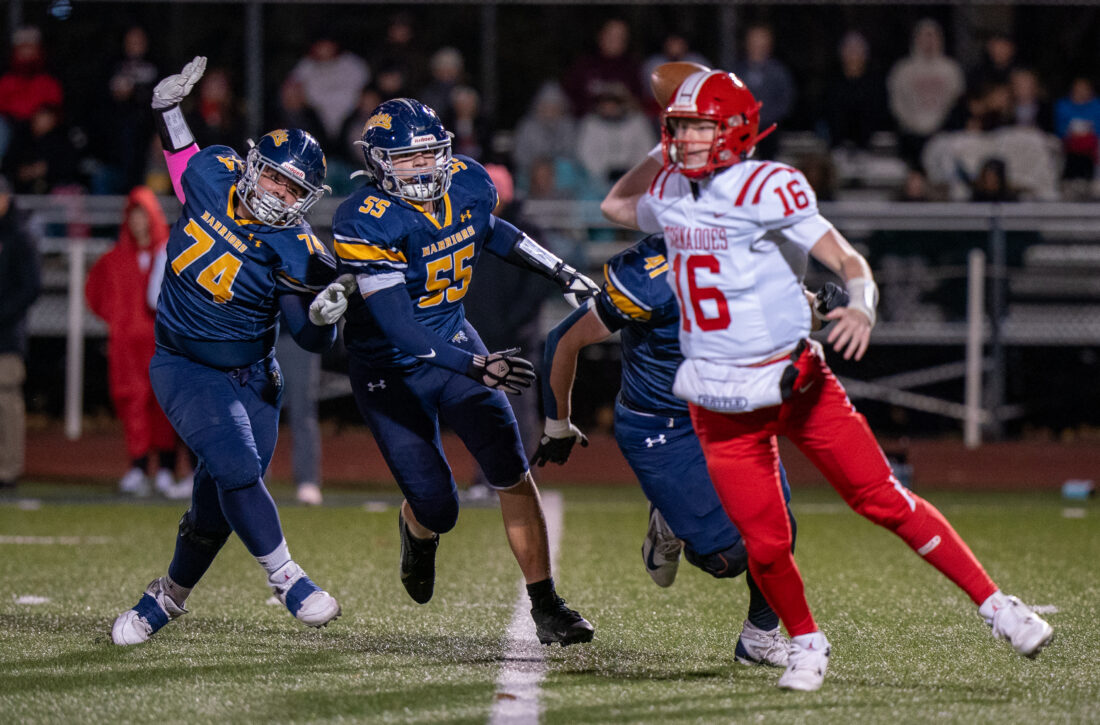 Hunter Shaffer (74), Branson Fogelman (55), and Kingston Fisher (41) pressure quarterback Gavin Marshalek of Montoursville of Mt. Carmel at Montoursville High School Friday night. Montoursville won in triple overtime 43-42. DAVE KENNEDY/Sun-Gazette