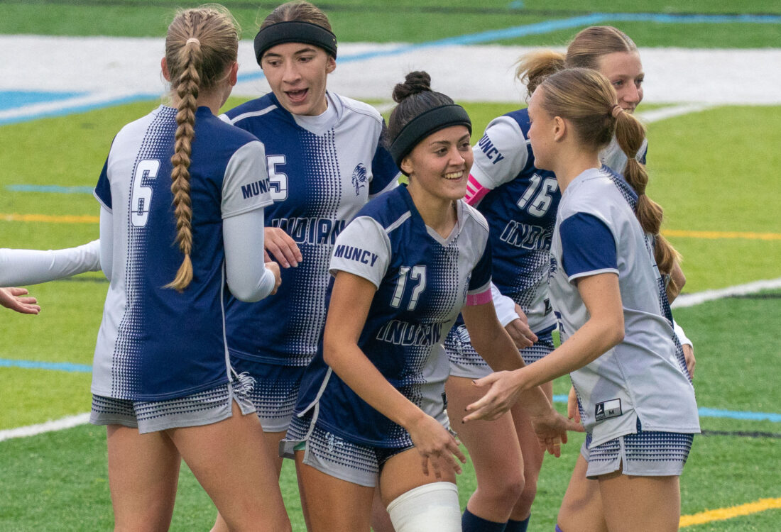 DAVE KENNEDY/Sun-Gazette Muncy’s Ella Nagel (17) celebrates with teammtes during a District 4 playoff game. Nagel was named Sun-Gazette Girls Soccer Player of the Year for 2025.