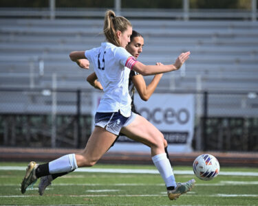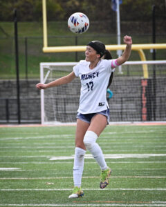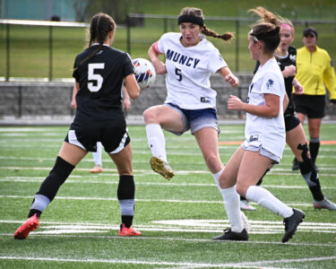 - RALPH WILSON/Sun-Gazette Correspondent Muncy’s Ella Nagel (17) connects with a header during the District 4 Class A championship game at Milton on Saturday.