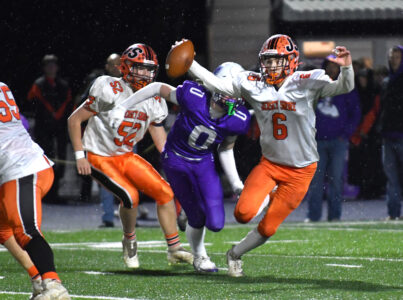 - MARK NANCE/Sun-Gazette Correspondent Shamokin’s Colin Steinhart (1) breaks up a pass intended for Jersey Shore’s Carter Rhinehart (3) in the fourth quarter.