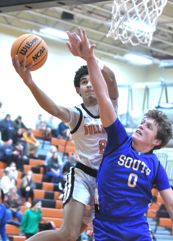 MARK NANCE/Sun-Gazette Correspondent Jersey Shore's Khan McCray (2) shoots around South Williamsport's Bobby Regan (0) in the first quarter.