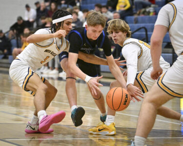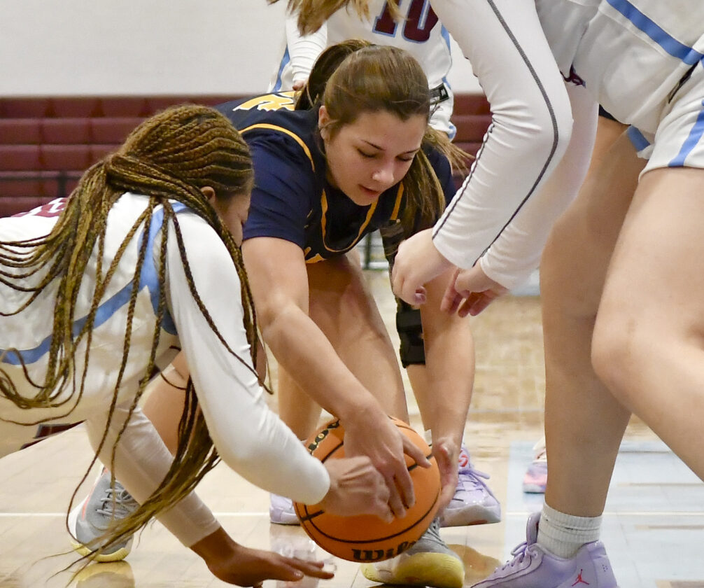 RALPH WILSON/Sun-Gazette Correspondent Montoursville's Dahlia Campbell (22) snags a loose ball away from a pair of Loyalsock defenders during a high school girls basketball game at Loyalsock Township on Friday.
