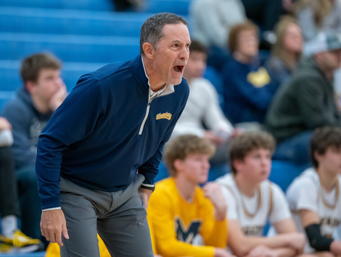 - Montoursville head coach Mike Mussina shouts to his team as they play Hughesville at Montoursville High School. Montoursville won 77-46. DAVE KENNEDY/Sun-Gazette