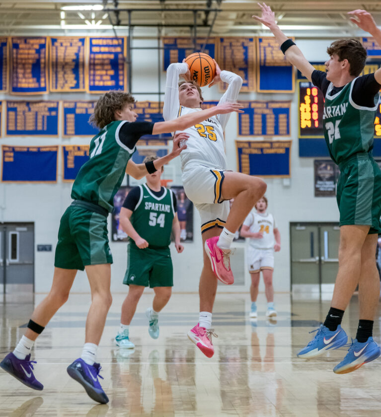 - Carson Menne of Montoursville puts up a shot under pressure from Alex Schultz (34) and Gavin Knarr (11) of Hughesville at Montoursville High School. Montoursville won 77-46. DAVE KENNEDY/Sun-Gazette
