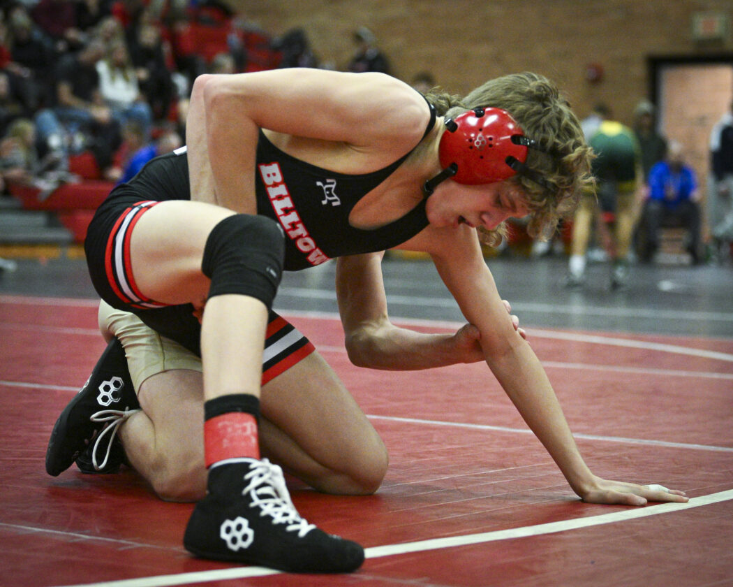 - RALPH WILSON/Sun-Gazette Correspondent Williamsport’s Jackson Raker wrestles Line Mountain’s Cade Feger in the 189 fifth place match during the Tom Best Memorial Top Hat tournament at Williamsport on Saturday.