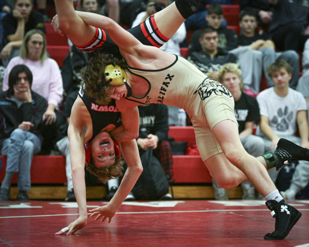 - RALPH WILSON/Sun-Gazette Correspondent Williamsport’s Jordan Piselli wrestles Halifax’s Izaya Schickley in the 114 first place match during the Tom Best Memorial Top Hat tournament at Williamsport on Saturday.