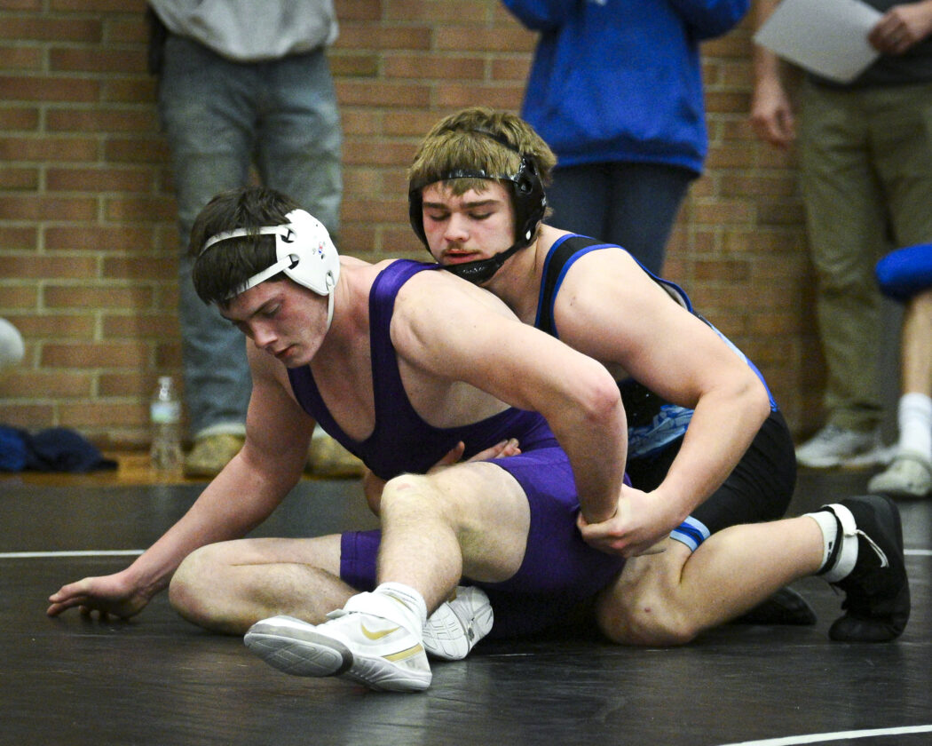 RALPH WILSON/Sun-Gazette Correspondent Williamsport's Jackson Raker wrestles Line Mountain's Cade Feger in the 189 fifth place match during the Tom Best Memorial Top Hat tournament at Williamsport on Saturday.