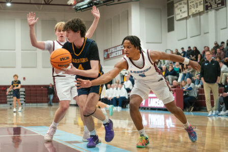 Kingston Fisher of Montoursville and Jalil Coates (center) and Saoj Jones of Loyalsock fight for possession of the ball at Loyalsock High School. Montoursville won 57-50. DAVE KENNEDY/Sun-Gazette