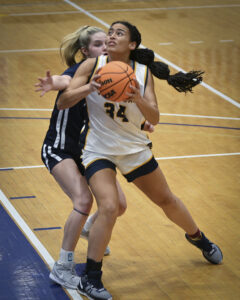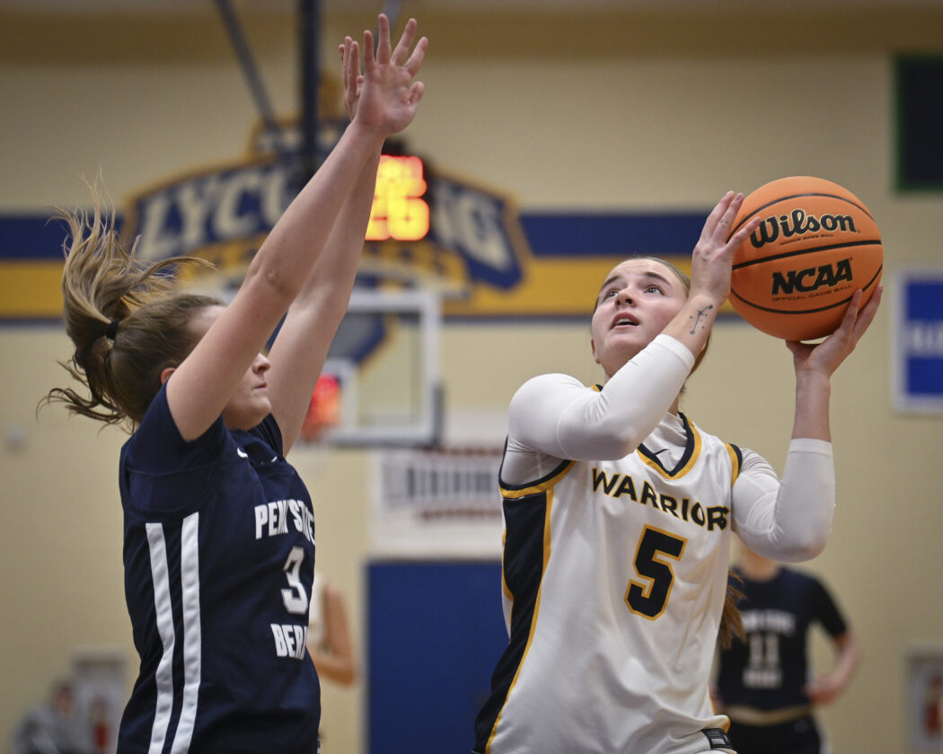 - RALPH WILSON/Sun-Gazette Correspondent Lycoming’s Ciara O’Hara (5) looks for a shot around Penn State Berks Annie Laubach (3) during a women’s basketball game at Lamade Gym on Monday.