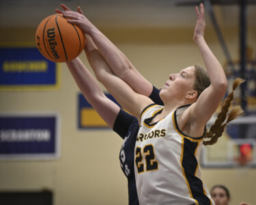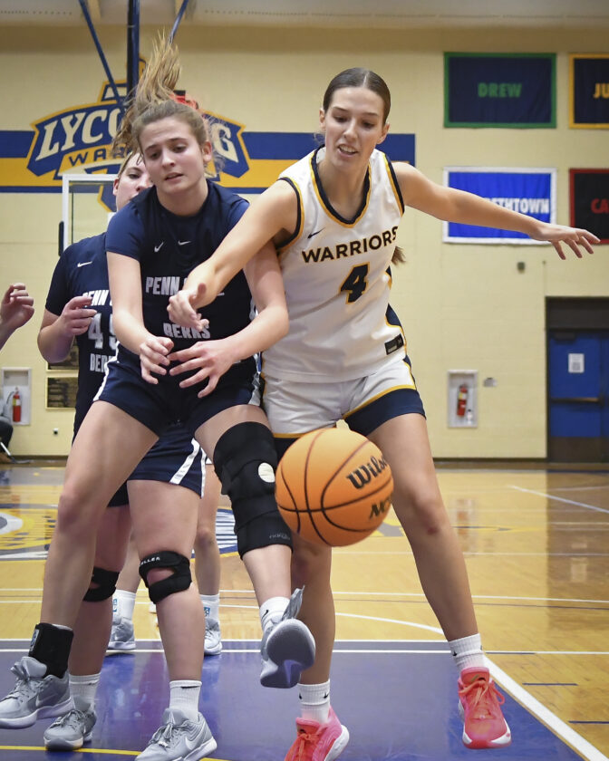 - RALPH WILSON/Sun-Gazette Correspondent Lycoming’s Ann-Marie McMurtrie (4) reaches for control of a rebound during a women’s basketball game against Penn State Berks at Lamade Gym on Monday.