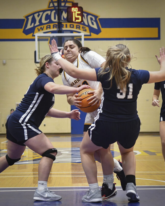 - RALPH WILSON/Sun-Gazette Correspondent Lycoming’s Gabrielle Mazzotte (13) struggles to get past a pair of Penn State Berks defenders during a women’s basketball game at Lamade Gym on Monday.