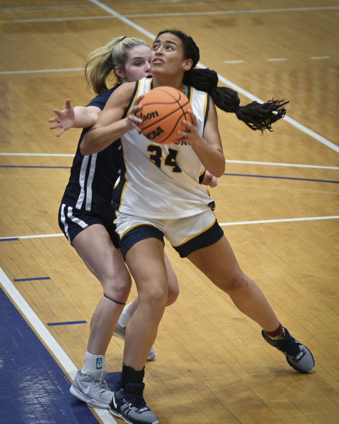 - RALPH WILSON/Sun-Gazette Correspondent Lycoming’s Victoria Burton (34) eyes a shot around a Penn State Berks defender during a women’s basketball game at Lamade Gym on Monday.