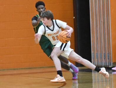 - MARK NANCE/Sun-Gazette Correspondent Lewisburg’s Cortland Michaels (0) drives the ball down court in front of Jersey Shore’s Khani McCray (2) in the second quarter.