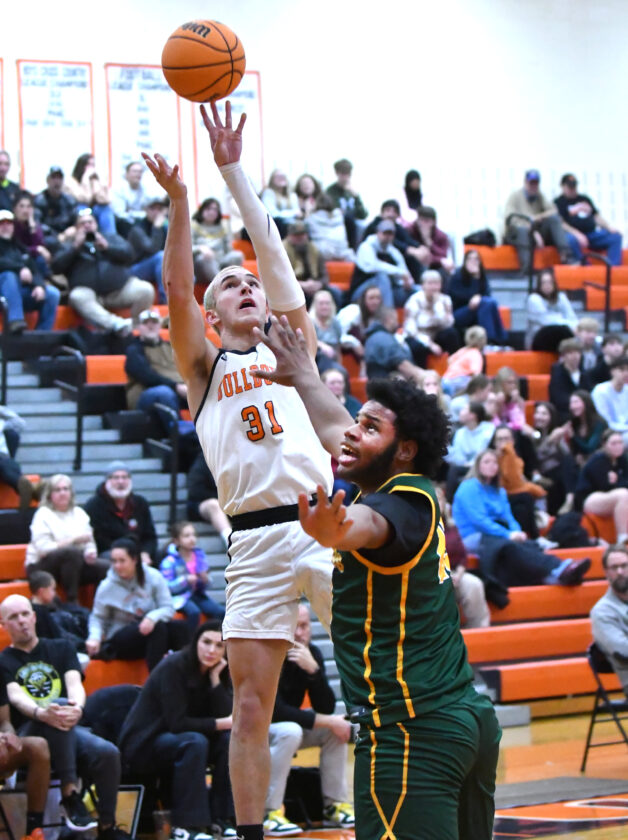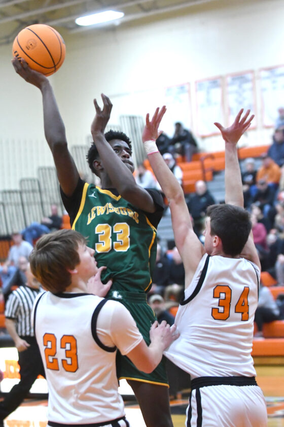 - MARK NANCE/Sun-Gazette Correspondent Lewisburg’s Cortland Michaels (33) shoots over Jersey Shore’s Jacob Lorson (23) and Tucker Hanna (34) in the second quarter.