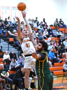 - MARK NANCE/Sun-Gazette Correspondent Jersey Shore’s Breylan Guerrero (31) shoots over Lewisburg’s (23) in the first quarter.