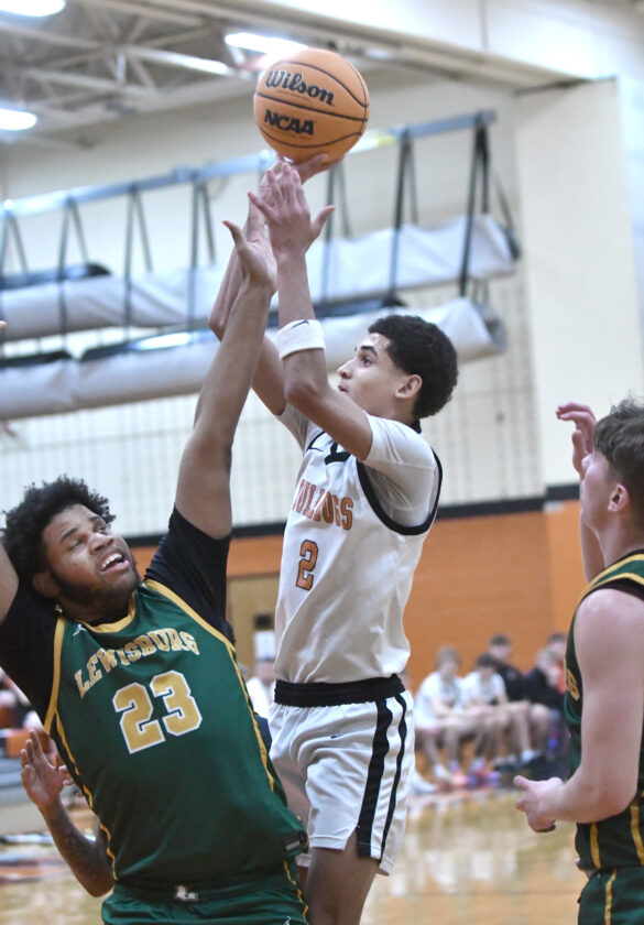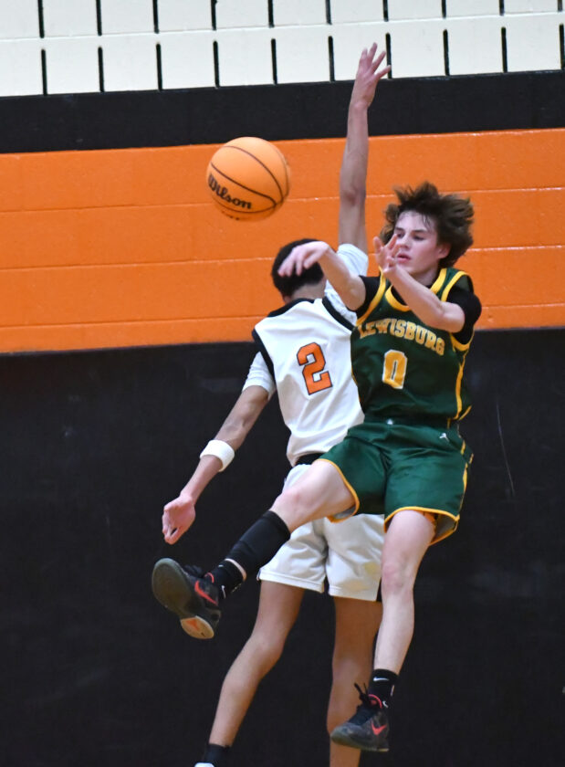 - MARK NANCE/Sun-Gazette Correspondent Lewisburg’s Lj Tucker (3) tries to shoot over Jersey Shore’s (23) in the second quarter.