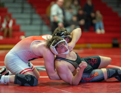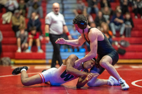 - Austin Dunlop of Williamsport is taken to the mat by Tobias Morgret of Jersey Shore during their match at 160 pounds at Williamsport High School. DAVE KENNEDY/Sun-Gazette