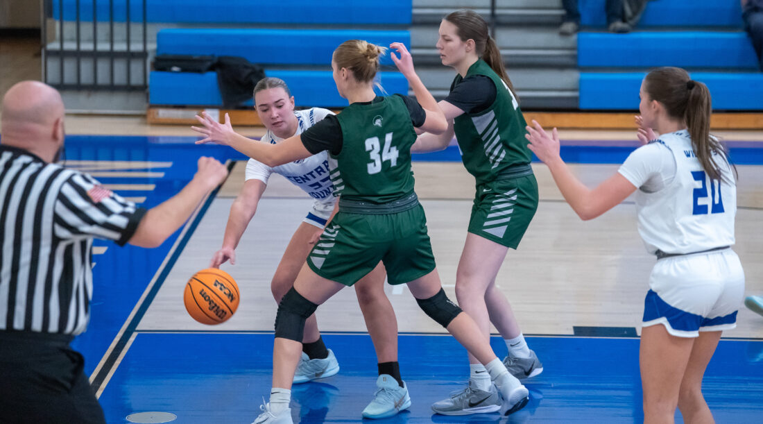 - Morgan Davis of Central Mountain passes out of the double team against Hughesville at Central Mountain High School. Hughesville won 65-40. DAVE KENNEDY/Sun-Gazette