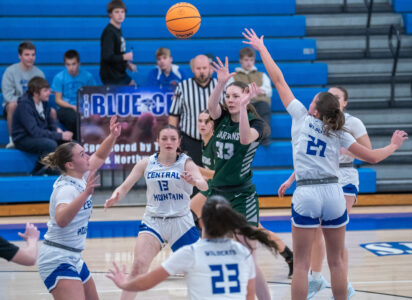 - Anna Easton of Hughesville passes over the defense of Central Mountain at Central Mountain High School. Hughesville won 65-40. DAVE KENNEDY/Sun-Gazette