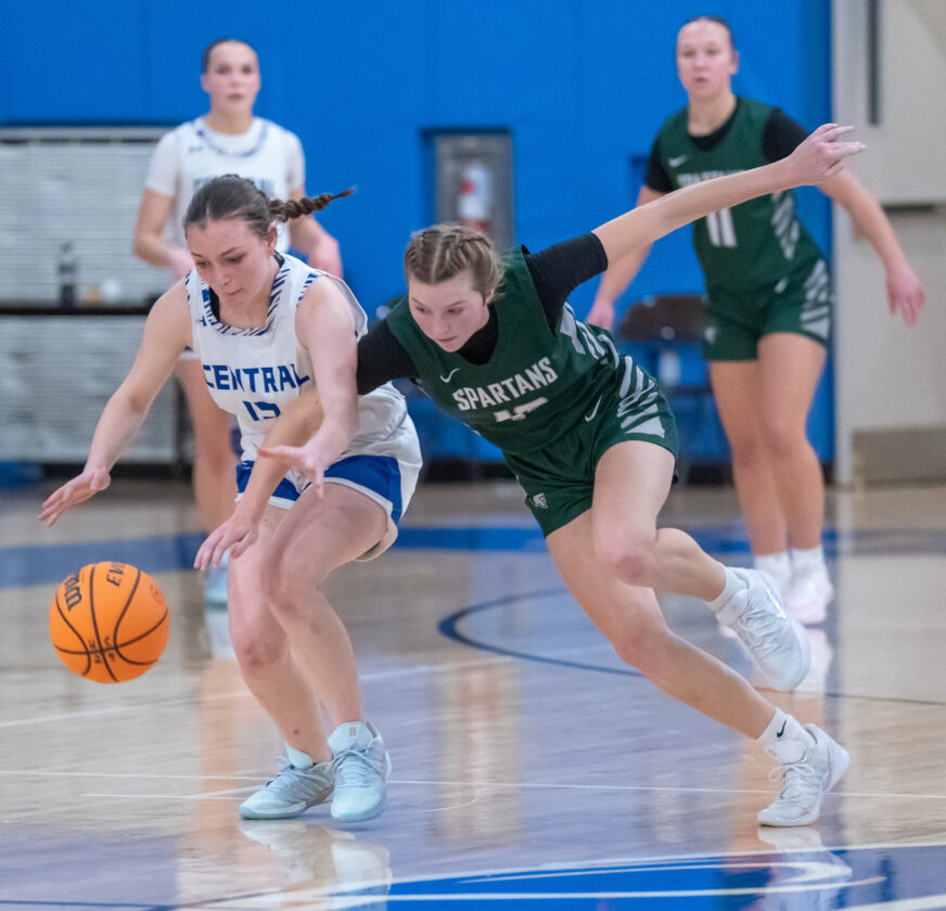 - Vivian Draper (34) of Hughesville and Camdyn Weaver (20) of Central Mountain reach for a loose ball at Central Mountain High School. Hughesville won 65-40. DAVE KENNEDY/Sun-Gazette