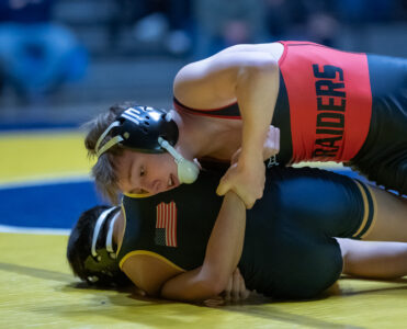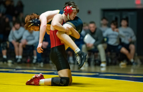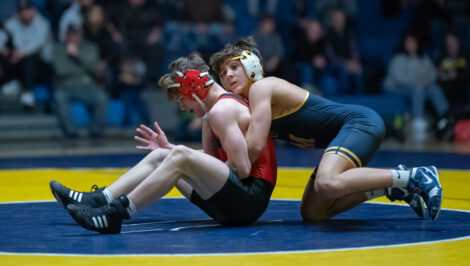 The dual wasted no time grabbing the attention of a large and boisterous crowd inside Montoursville High School. Montoursville’s upset-minded Kaden Kleinman scored the opening takedown over AJ Kroft in a wild scramble and led 3-2 after the first period. Kroft added to his lead midway through the third period with a takedown of his own to go up, 7-3. But with 25 seconds left, Kleinman scored a reversal at the edge of the mat and elected to go neutral on the ensuing restart.