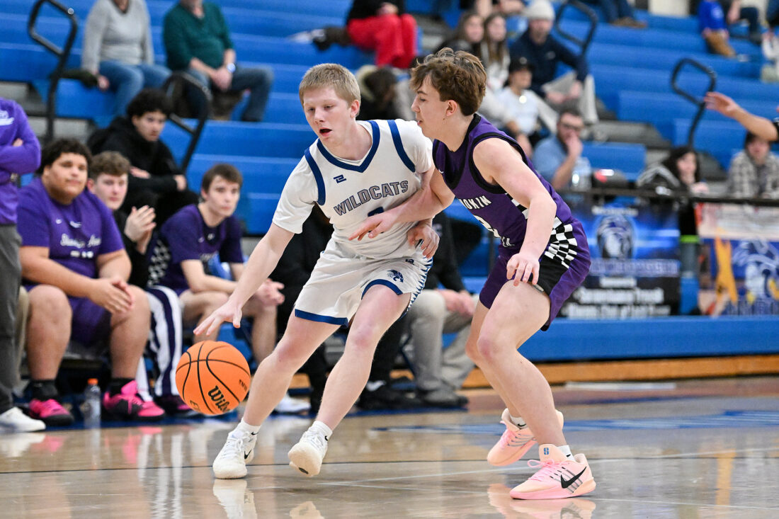 TIM WEIGHT/Special to the Sun-Gazette Central Mountain's Blake Walker (0) works to get past a Shamokin defender during a boys basketball game against Shamokin on Saturday, Jan. 3, 2026, at Central Mountain. The Wildcats fell 66-60.