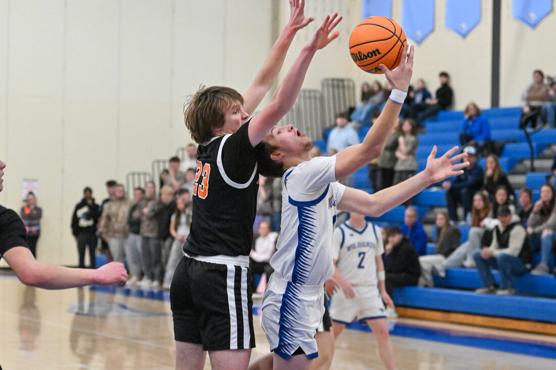 TIM WEIGHT/Special to the Sun-Gazette Central Mountain's Carson Corturiaux takes a contested layup over Jersey Shore's Jacob Lorson during a boys basketball game on Friday, Jan. 23, 2026, at Central Mountain. The Wildcats won 60-56.
