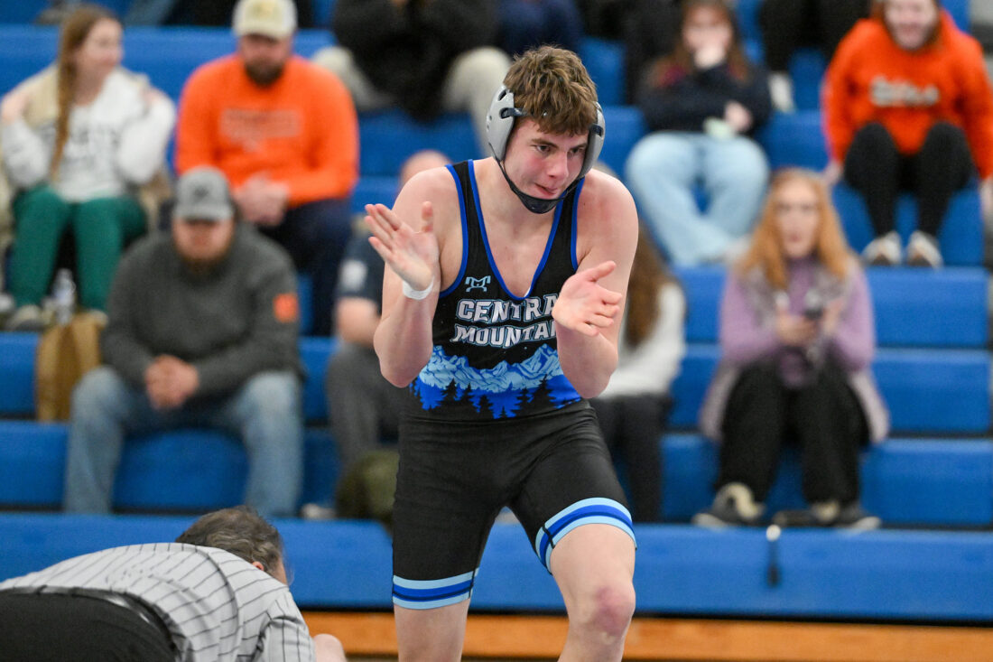 - TIM WEIGHT/Special to the Sun-Gazette Central Mountain’s Mario Serafini reacts after securing a pin during a boys wrestling dual on Thursday, Jan. 22, 2026, at Central Mountain. The Wildcats won 64-6.