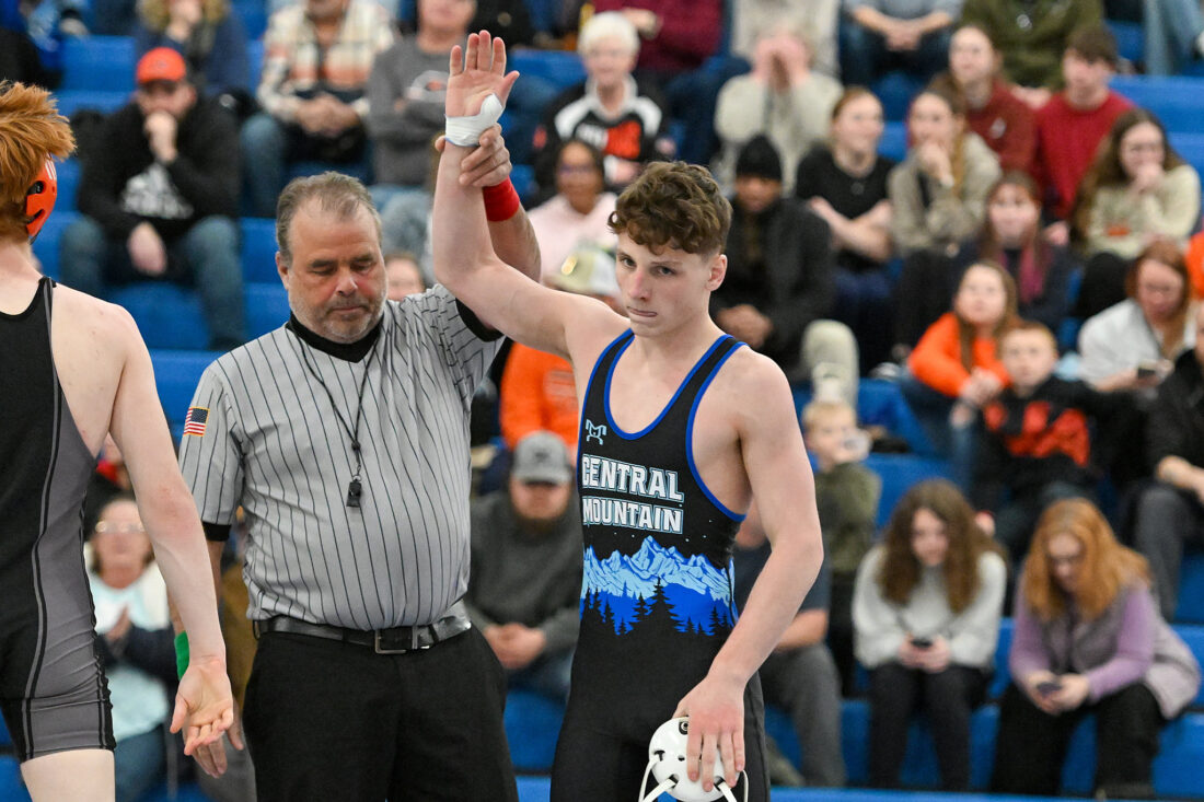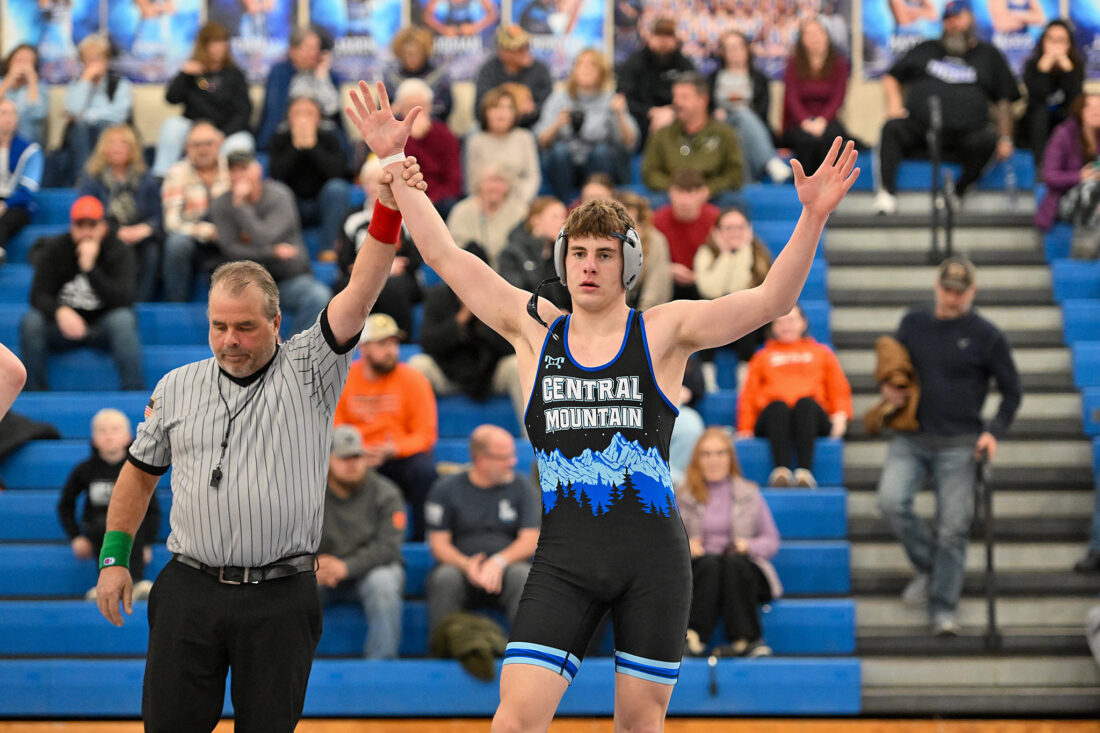 - TIM WEIGHT/Special to the Sun-Gazette Central Mountain’s Patrick Tarantella gets his hand raised during a boys wrestling dual on Thursday, Jan. 22, 2026, at Central Mountain. The Wildcats won 64-6.