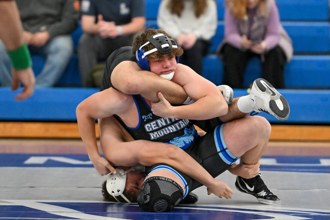 - TIM WEIGHT/Special to the Sun-Gazette Central Mountain’s Hunter Donley wrestles Jersey Shore’s Riley Kanski at 189 during a boys wrestling dual on Thursday, Jan. 22, 2026, at Central Mountain. The Wildcats won 64-6.