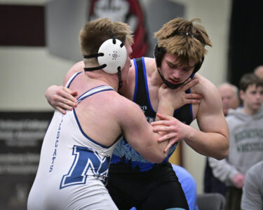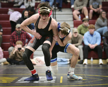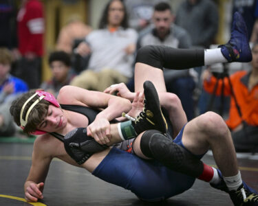 - RALPH WILSON/Sun-Gazette Correspondent Williamsport’s Collin Nasdeo wrestles Central Mountain’s Gavin Heverly at 127 during the semifinal rounds of the PHAC wrestling championships at Bloomsburg University on Saturday.