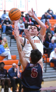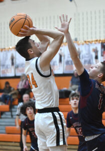 - MARK NANCE/Sun-Gazette Correspondent Jersey Shore’s Tucker Hanna (34) shoots over Shikellamy’s Aaron Bucher (1) in the first quarter.