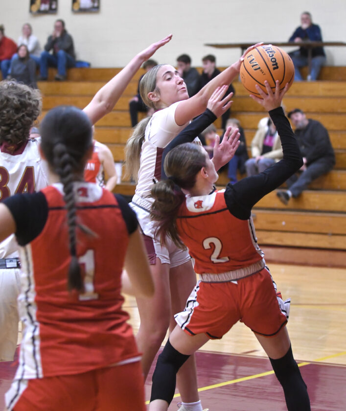 - MARK NANCE/Sun-Gazette Correspondent St. John Neumann’s Kaydance Meixel (2) blocks a shot by Sullivan County’s Ansley Baldwin (2) in the second quarter.