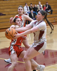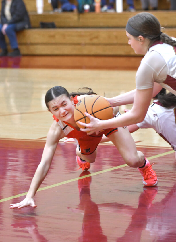 - MARK NANCE/Sun-Gazette Correspondent St. John Neumann’s Kaydance Meixel (2) and Sullivan County’s Zoey Reese (14) battle for a loose ball in the first quarter.