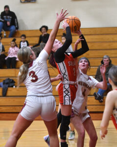 - MARK NANCE/Sun-Gazette Correspondent Sullivan County’s Lily McCarty (3) shoots between St. John Neumann’s Kallee Johnson (3) and Brooklyn Clabaugh (4) in the first quarter.