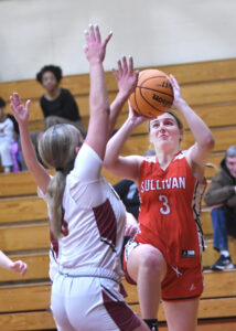 - MARK NANCE/Sun-Gazette Correspondent Sullivan County’s Lily McCarty (3) shoots over St. John Neumann’s Kallee Johnson (3) in the second quarter.