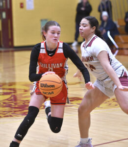- MARK NANCE/Sun-Gazette Correspondent St. John Neumann’s Haylee Meixel (12) drives the ball down court ahead of Sullivan County’s Alana Olsan (11) in the first quarter.