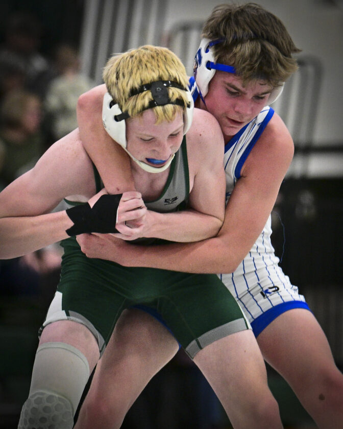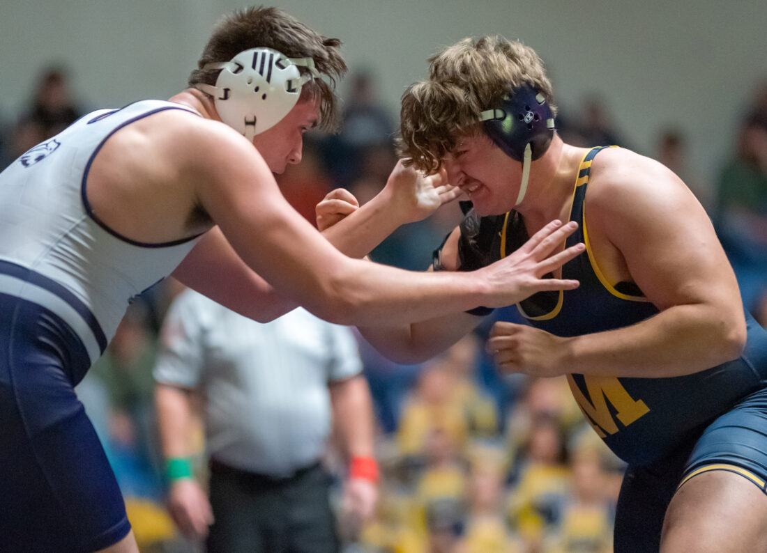 DAVE KENNEDY/Sun-Gazette Gabriel Vanderwall of Montoursville and Landon Moser of Mifflinburg tie up during their match at 285 pounds at Montoursville during a dual in mid-January. Mifflinburg and Montoursville are both state ranked in the top-15 and are in the District 4 Duals tournament, as is state-ranked Montgomery. All three schools are looking to win the District 4 Duals tournament this year, and all three have the talent to do so.