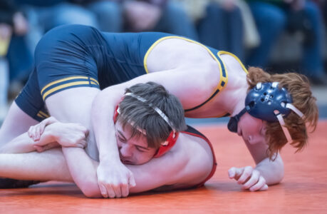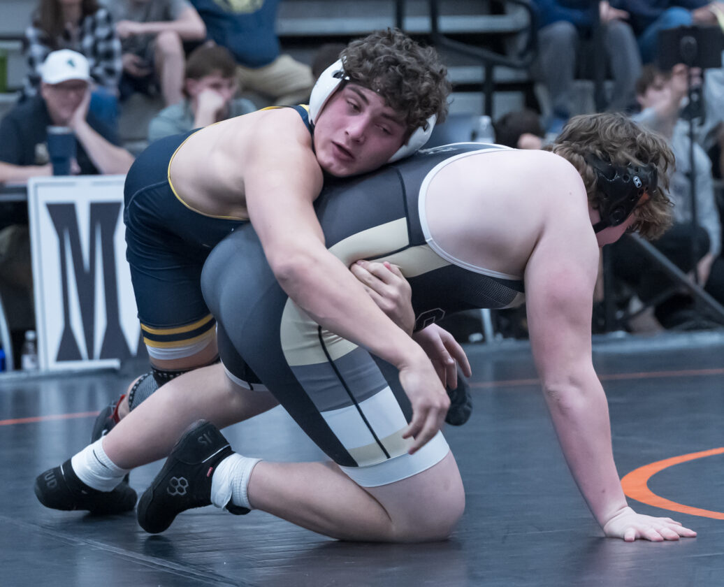 - FRANK DIMON/Sun-Gazette Correspondent Montoursville’s Gabe Vanderwall ites up Southern’s Braylin Smith during the District 4 Class AA Duals consolations.
