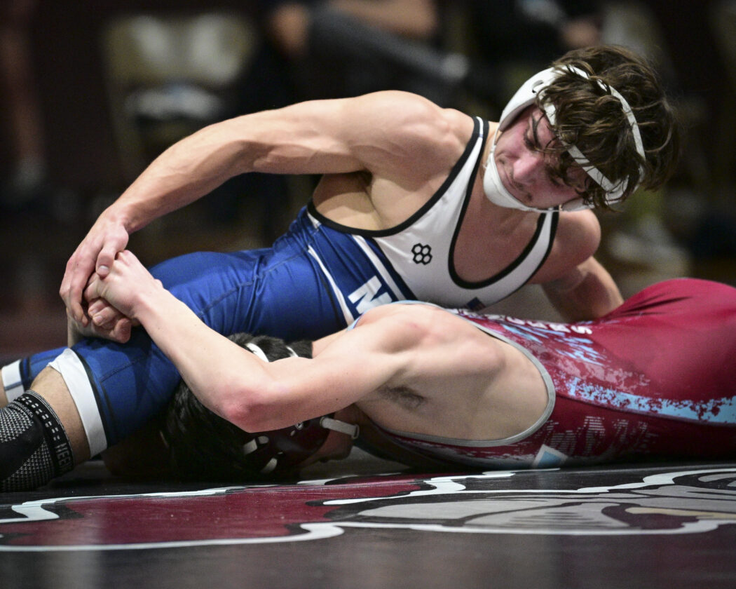 - RALPH WILSON/Sun-Gazette Correspondent Loyalsock’s Cooper Cowden wrestles Muncy’s Cameron Caldwell at 172 during a high school boys wrestling match at Loyalsock on Tuesday.