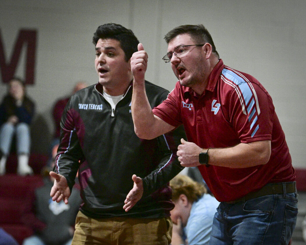 - RALPH WILSON/Sun-Gazette Correspondent Loyalsock coach Chris Engler (right) and assistant Ricky Tedesco yell to their wrestler during Tuesday’s dual against Muncy at Loyalsock. Muncy won, 38-30, in a match that came down to the final bout.