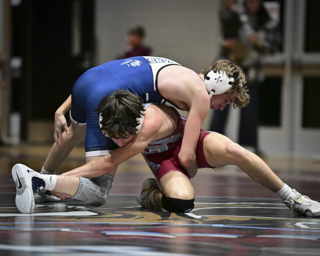 RALPH WILSON/Sun-Gazette Correspondent Loyalsock's Cooper Cowden wrestles Muncy's Cameron Caldwell at 172 during a high school boys wrestling match at Loyalsock on Tuesday.