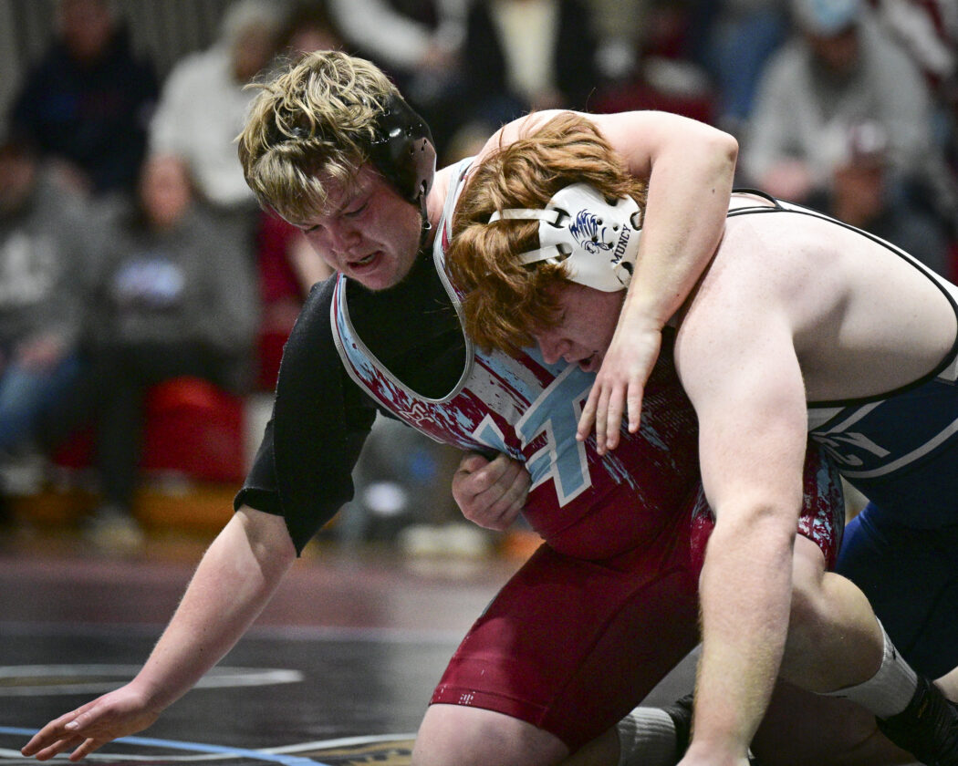 - RALPH WILSON/Sun-Gazette Correspondent Loyalsock’s Isaac Probst wrestles Muncy’s Dylan Sander at 215 during a high school boys wrestling match at Loyalsock on Tuesday.